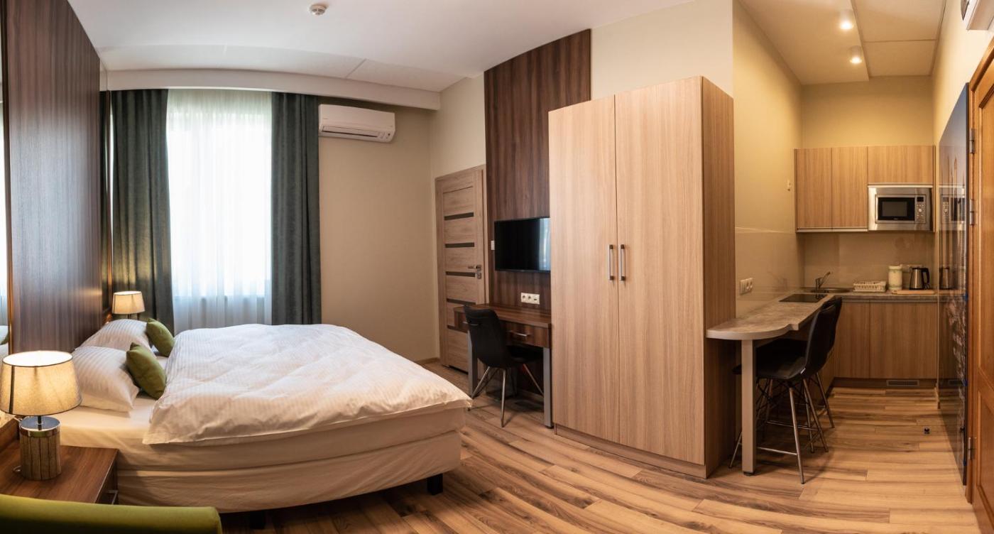 Studio typu Deluxe. Providing free toiletries, this studio includes a private bathroom with a walk-in shower and a hairdryer. Guests can make meals in the kitchen that is equipped with a stovetop, a refrigerator, kitchenware and a microwave. The air-conditioned studio provides a flat-screen TV with satellite channels, a tea and coffee maker, executive lounge access, a seating area as well as city views. The unit offers 2 beds. Studio - 3 osobowy. Powierzchnia pokoju ok.: 28 mkw. ;